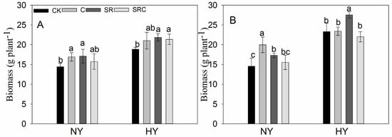 Effects of biochar and soft rock treatments on millet biomass at flowering under two fertilizer levels conducted in 2018 (A) and 2019 (B). CK, sand only; C, sand and biochar; SR, sand and soft rock; SRC, sand, biochar, and soft rock; NY, normal yield pattern; HY, high yield pattern. Data were shown in mean ± SE. Different letters indicate significant differences (p < 0.05).