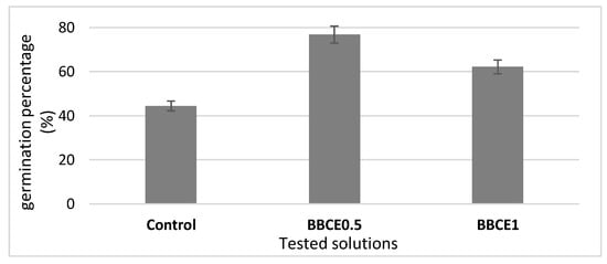 The influence of beech (Fagus sylvatica L.) bark crude extract (BBCE) on Salvia officinalis L. seed germination capacity. Error bars represent the standard deviations of means. BBCE0.5—beech bark crude extract 0.5 g bark/100 mL extract; BBCE1—beech bark crude extract 1 g bark/100 mL extract.