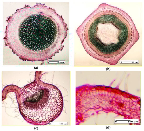 Taking into consideration the internal structure of the sage root (Figure 3a), the rhizodermis exfoliates in the early stage of the development process. The vascular tissue’s origin is mostly cambial and forms two concentric rings, which includes very narrow phloem and very thick xylem with many vascular bundles. Analyzing the internal structure of the roots, there are no significant differences between the samples (Table 3).
