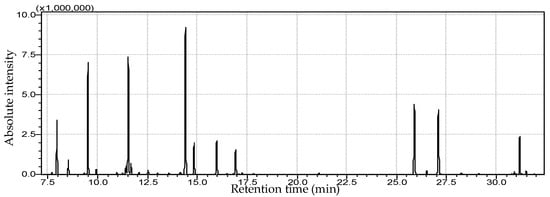 The working hypothesis for this experiment stage was that BBCE applied to sage plants will influence the chemical composition of the essential oil produced. Thus, the GC-MS chromatograms were obtained (Figure 4), and the data were processed, comparing the experimental variant with the control results.