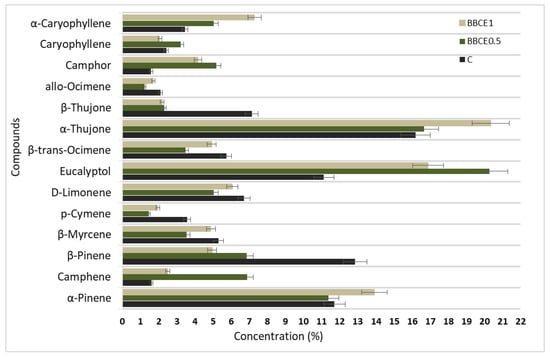 Representative graphic for concentrations (peak area percent) of the main volatile compounds from Salviae folium, obtained by GC-MS method. Error bars represent the standard deviations of means. C—Control; BBCE0.5—beech bark crude extract 0.5 g bark/100 mL extract; BBCE1—beech bark crude extract 1 g bark/100 mL extract.