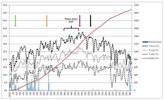 Weather conditions (April 1st—October 31st) of the 2018 vegetative season. Rainfall, daily rainfall (mm); T max, daily maximum temperature (°C); T avg, daily average temperature (°C); T min, daily minimum temperature (°C); GDDs, growing degree days (base 10 °C); DOY, day of year. The green arrow indicates the date of bud burst (DOY 100), the orange arrow indicates the date of flowering (DOY 155), the purple arrow indicates the date of full veraison (DOY 211), and the black arrow indicates the date of harvest (DOY 232). The black brace indicates the period of water stress trial (July 4th (DOY 185) to July 29th (DOY 210)).
