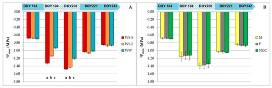Midday stem water potentials (Ψstem, MPa) in adult leaves of Pinot noir, subjected to three irrigations protocols: (A) WS-S in red, WS-I in orange, and WW in blue. Leaf Water Potentials (Ψstem, MPa) in adult leaves in the three root systems: (B) Mgt 101-14 (M) in yellow, 1103 Paulsen (P) in dark grey, and not grafted vines (NGC) in green. The measurements were conducted before (DOY 184), during (DOYs 194 and 208, marked with dashed lines), and after (DOYs 221 and 232) the water stress trial. The bars indicate the standard error. Different letters indicate significant differences (LSD test, P < 0.05).