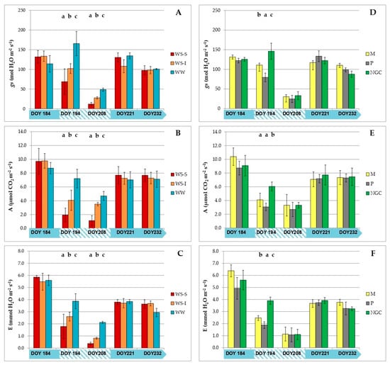 Leaf gas exchange: (A–C) Stomatal conductance (gs), net assimilation (A), and leaf transpiration (E) in adult leaves of Pinot noir, subjected to three irrigations protocols (WS-S in red, WS-I in orange, and WW in blue); and (D–F) stomatal conductance (gs), net assimilation (A), and leaf transpiration (E) in adult leaves of Pinot noir grafted on Mgt 101-14 (M, in yellow), 1103 Paulsen (P, in dark grey), and not grafted vines (NGC, in green). The measurements were conducted before (DOY 184), during (DOYs 194 and 208, marked with dashed lines), and after (DOYs 221 and 232) the water stress trial. The bars indicate the standard error. Different letters indicate significant differences (LSD test, P < 0.05).