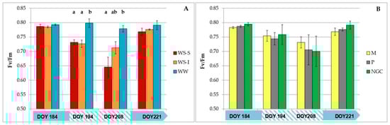Chlorophyll fluorescence (Fv/Fm) in adult leaves of Pinot noir, subjected to three irrigations protocols: (A) WS-S in red, WS-I in orange, and WW in blue. Chlorophyll fluorescence (Fv/Fm) in adult leaves in the three root systems: (B) Mgt 101-14 (M) in yellow, 1103 Paulsen (P) in dark grey, and not grafted vines (NGC) in green. The measurements were conducted before (DOY 184), during (DOYs 194 and 208, marked with dashed lines), and after (DOY 221) the water stress trial. The bars indicate the standard error. Different letters indicate significant differences (LSD test, P < 0.05).