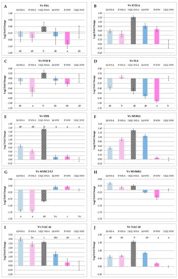 Expression profiles of the ten selected genes coding for structural genes and transcription factors obtained by qRT-PCR. Log2 Fold Change, calculated with the ΔΔCt method, of VvPAL (A), VvF3′H A (B), VvF3′H B (C), VvFLS (D), VvDFR (E), VvMYB14 (F), VvMYBC2-L3 (G), VvMYB4R1 (H), VvNAC44 (I), and VvNAC60 (J). The error bars indicate the standard deviation. Sample names: M-WS-S, vines grafted on Mgt 101-14 subjected to severe water stress (in checkered light blue); P-WS-S, vines grafted on 1103 Paulsen subjected to severe water stress (in checkered pink); NGC, not grafted control vines subjected to severe water stress (in checkered black); M-WW, well-watered vines grafted on Mgt 101-14 (in light blue); P-WW, well-watered vines grafted on 1103 Paulsen (in pink); NGC-WW, well-watered not grafted vines (control). Different letters indicate significant differences (LSD test, P < 0.05).