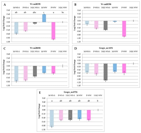 Expression profiles of the five selected miRNAs obtained by qRT-PCR. Log2 Fold Change, calculated with the ΔΔCt method, of miR395 (A), miR398 (B), miR858 (C), Grape_m-1191 (D), and Grape_m-0721 (E). The error bars indicate the standard deviation. Sample names: M-WS-S, vines grafted on Mgt 101-14 subjected to severe water stress (in checkered light blue); P-WS-S, vines grafted on 1103 Paulsen subjected to severe water stress (in checkered pink); NGC, not grafted control vines subjected to severe water stress (in checkered black); WS, water stress; M-WW, well-watered vines grafted on Mgt 101-14 (in light blue); P-WW, well-watered vines grafted on 1103 Paulsen (in pink); NGC-WW, well-watered not grafted vines (control). Different letters indicate significant differences (LSD test, P < 0.05).