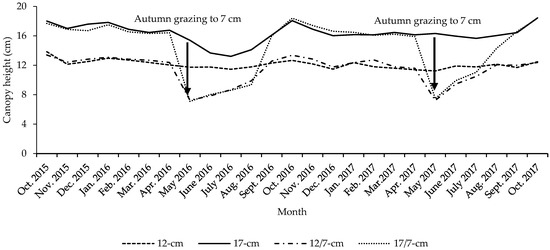 Canopy height of pastures composed of kikuyu-grass and tall fescue during the years 2015, 2016, and 2017. Treatments 12 cm and 17 cm represent canopy heights maintained uninterrupted throughout the experiment; treatments 12/7 cm and 17/7 cm represent the canopy heights with autumn grazing to 7 cm height in May.