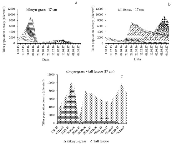 On the other hand, kikuyu-grass tillering decreased as the canopy height increased. Kikuyu-grass persistence was dependent on the frequent recruitment of tillers, since it was characterized by short-lived tillers (3–4 months, on average), even under more lenient management conditions. This fact, associated with the occurrence of frost during the autumn of 2016 and greater shade due to an increase in the tall fescue population in the more lenient management conditions during winter, likely prevented the restoration of kikuyu-grass during the summer of 2017. Moreover, probably, the amount of carbohydrates stored in the roots and stems [20] of kikuyu-grass was not sufficient to provide an adequate regrowth in summer to withstand the highly stressful/disturbing cool season (autumn and winter), which led to an almost null population of this plant at the end of the experimental period. In addition, the absence of nitrogen fertilization in the summer might have directly affected the loss of persistence of kikuyu-grass growing under more lenient grazing managements (17 and 17/7 cm), considering that plants functionally defined as exploitative, such as kikuyu-grass, tend to deplete water and carbohydrate reserves when continuously submitted to low-fertility environments [21].