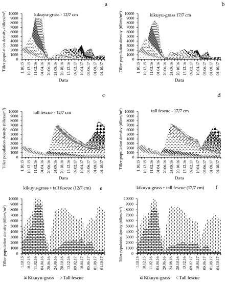 Studying tillering dynamics in pure stands of tall fescue in a Cfb climate [9] found that tiller cohorts that appeared during autumn/winter were crucial to ensure tall fescue persistence until the same period of the next year. On the other hand, Pennisetum clandestinum Hochst. ex Chiov. (kikuyu-grass; a warm-season perennial grass) does not present a specific cohort that plays a fundamental role to guarantee its persistence [10], illustrating the relevance of a continuous replacement of tillers to extend its longevity over time. Kikuyu-grass plants are severely injured by frosts during autumn/winter but, normally experience regrowth in the spring [11], and therefore, this species seems to be a viable candidate to compose a stable mixture with tall fescue. However, it could be interesting to adopt strategies that reduce interspecific competition from mid-autumn to late winter and possibly stimulate and/or intensify the growth of tall fescue in this period. Thus, the removal of aerial biomass by hard grazing would allow greater light penetration at the base of the canopy, and possibly stimulate tillering [12,13,14] of tall fescue plants.