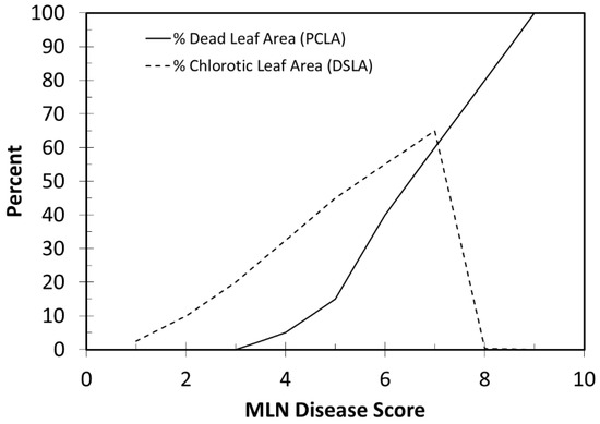The MLN disease score, on a scale of 1–9, is based on a combination of necrosis due to the disease, including dead leaf area. A mathematical relationship was developed to translate MLN disease scores into percent leaf chlorosis and percent dead leaf area (Figure 1). In this relationship, percent chlorotic leaf area increases linearly from 0% chlorosis at a disease score of 1.0 to 65% chlorosis at a disease score of 7.0. Percent chlorosis decreases to 0% above a disease score of 8.0 because, at that level, there is almost no green leaf area remaining on the plant. Percent dead leaf area increases from 0% at a disease score of 3.0 to 100% at a disease score of 9.0. This relationship is nonlinear between disease scores of 3.0–5.0, then follows a linear relationship from disease scores of 5.0–9.0. These relationships were used to convert observed disease scores into percent necrotic and/or dead leaf area to simulate disease damage in the crop model. These relationships are used to train technicians on how to score the disease severity.