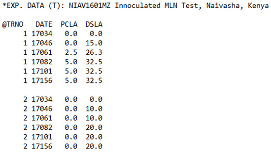 Figure 1 also shows the relationship between observed MLN disease score and percent chlorosis. Daily percent chlorosis is defined in the CERES-Maize pest definition file as a daily percent reduction in photosynthesis, where percent chlorosis is applied as percent reduction in daily photosynthesis. Observed percent chlorosis is entered into the time series file using the DSLA (percent diseased leaf area) header (Figure 2). The model computes the diseased leaf area (DISLA, cm2 pl−1 d−1) based on DISLA and leaf area each day. Reduction in daily crop growth rate (CARBO) is computed by: