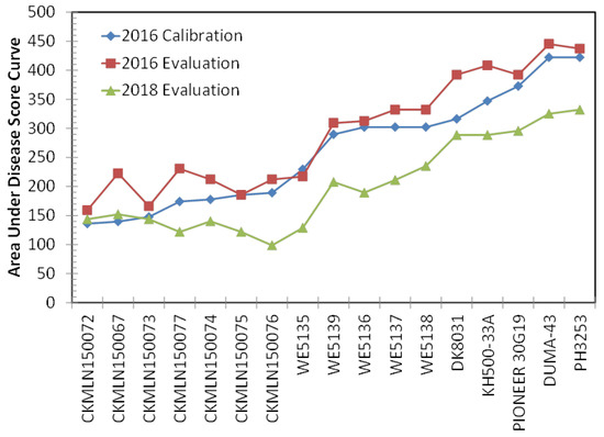 Area under the disease score curve for each maize hybrid and the calibration and evaluation treatments.