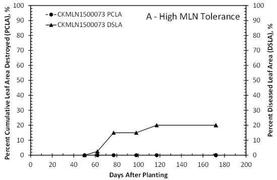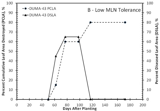 Disease scores were converted into percent cumulative leaf area destroyed (PCLA) and percent chlorotic leaf area (DSLA) using the relationships shown in Figure 1. Both PCLA and DSLA are required inputs for the crop model to simulate disease damage. Figure 4A shows an example of PCLA and DSLA for CKMLN1500073, an MLN tolerant hybrid for the 2016 calibration treatment. There was no observed dead leaf area, and the maximum chlorosis was only 20%. Figure 4B shows the values for PCLA and DSLA for DUMA-43, an MLN-susceptible hybrid check. Significant dead leaf area and chlorosis were observed in this hybrid, with a maximum dead leaf area of 80% and maximum diseased leaf area of 68%. This damage resulted in either premature plant death or very low grain yield.