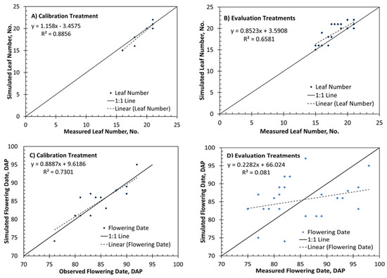 Figure 5D shows the simulated and observed flowering date for the 2016 and 2018 evaluation treatments. There was generally more error in simulating flowering date than leaf number or grain yield. However, errors in total leaf numbers influence the simulated flowering date. There was no correlation between simulated and observed flowering date, with an R2 of 0.08 and a D-statistic of 0.55. However, the RMSE was 7.1 days and the mean absolute error was 6.6 days, providing a reasonable estimate of flowering date. More robust data from multiple seasons or locations would likely improve the model calibration.