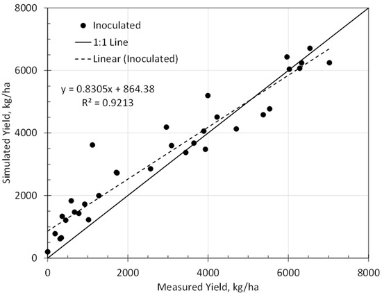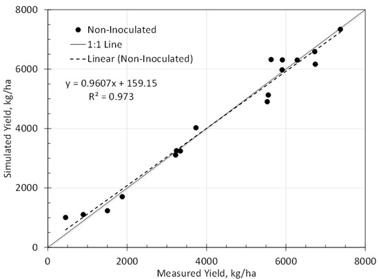 Data from the non-inoculated treatment 2 in 2016 were used to estimate the genetic coefficients required for each of the 17 hybrids (Table 1). The coefficient P1 (thermal time from emergence to the end of the juvenile phase) and PHINT (degree days between successive leaf tip appearance) were calibrated to minimize error between simulated and observed leaf number and flowering date. The P5 coefficient (growing degree days from silking to maturity) was calibrated based on the estimated maturity date. Coefficients G2 (maximum possible kernels per plant) and G3 (kernel filling rate) were estimated to minimize the error between simulated and measured yield. Data from the 2016 and 2018 inoculated treatments (treatment 1) were used to evaluate the model.
