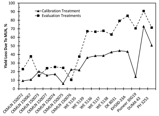 Simulated yield loss due to MLN damage for the calibration treatment and the average of the evaluation treatments for each hybrid.