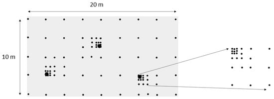 Spatial heterogeneity in soil properties and vegetation was assessed using a grid of 120 sampling points in a partly nested design across each study plot (Figure 1). In brief, a regular grid was spaced at 2.5 m intervals (45 sampling points) and then divided into three subplots, each consisting of eight 2.5 m × 2.5 m cells. Within each subplot, one 2.5 m × 2.5 m cell was randomly selected, and nested sample points were defined on an increasingly fine scale (1.25 m, 0.63 m, 0.31 m, 0.16 m and 0.08 m) resulting in a further 25 sampling points per subplot. Geographic coordinates of each sample point were established (Trimble R8 GPS Systems, Trimble Navigation Limited, Sunnyvale, CA, USA). This sampling scheme was chosen to optimize variogram modeling following []. We recognize that the design is limited because the fenced sites define only one formal replicate per treatment, but (i) this is common practice in geostatistical studies given the high within-site sampling effort necessary for determining variability of soil properties in ecosystems [,,], and (ii) we consider the management treatments to be sufficiently distinct and well-established to drive site differences and to allow for detection of land use effects.