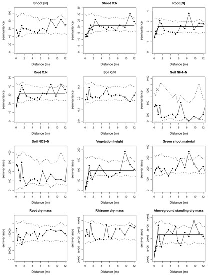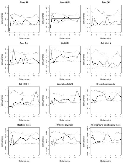 Semivariance of plant and soil properties (0−10 cm soil layer) under sheep grazing. Dashed lines show 95% interval of 1000 random permutations. Solid lines represent fitted spherical models where significant spatial autocorrelation was detected. Measurement units of variables are given in Table 1.