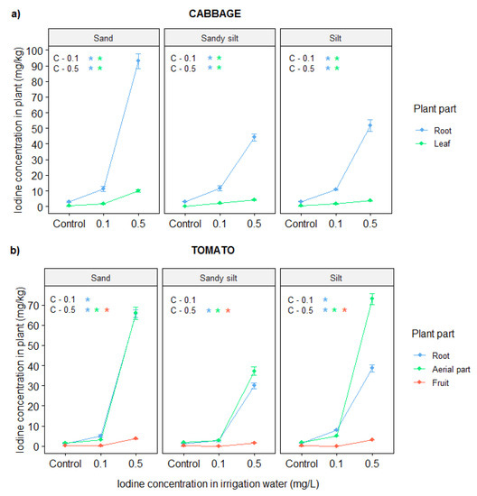 Iodine concentration (dry weight (DW)) in different parts of cabbage (a) and tomato (b) plants, cultivated in different soils (sand, sandy silt, silt), and irrigated with iodine containing (0.1 and 0.5 mg/L) irrigation water. Significant treatment effects are signed on the top left corner, * means p < 0.05 based on linear regression.