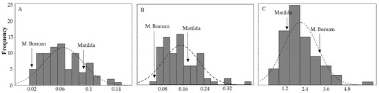 Phenotype distributions of (A) relative area under the disease progress curve (rAUDPC); (B) relative area under the defoliation curve (rAUC) and (C) volume of the infected area on tubers (cm3) for early blight disease among the offspring.