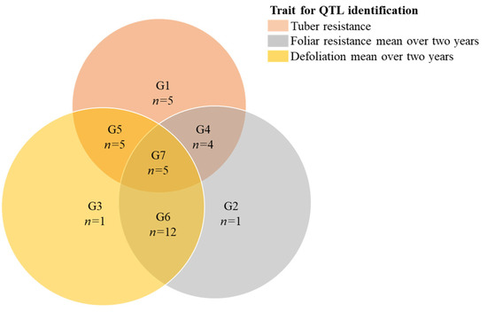 Venn’s diagram showing the seven different groups of predicted quantitative trait loci (QTL) for tuber resistance to early blight, mean foliar resistance to early blight over 2014 and 2016 and mean defoliation over 2015 and 2016. Grouping are created according to the probable dependency of the QTL, where a QTL can only be explained by a single trait (groups 1 to 3) if the area of the predicted QTL does not overlap with the area of a QTL predicted by another trait, and is not present on the corresponding chromosome from the other parental linkage map. QTL in groups 4 to 6 are possibly overlapping (dependent) on two phenotypic traits. Group 7 contains QTL that could not be declared independent in any of the three phenotypic traits.