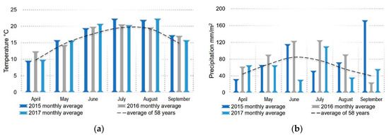 The experiment was established at the Agricultural Research and Development Station (ARDS) from Turda, Romania, located at 46°34′50.5″ N 23°47′16.4″ E and took place between 2015–2017. Climate is temperate continental [24]. The field had clay-loam soil type, with good nitrogen, phosphorus, potassium and micronutrient content, as well as an average humus level. Topsoil had neutral pH [25]. Temperatures and precipitation levels during the experimental period are presented in Figure 1a,b.