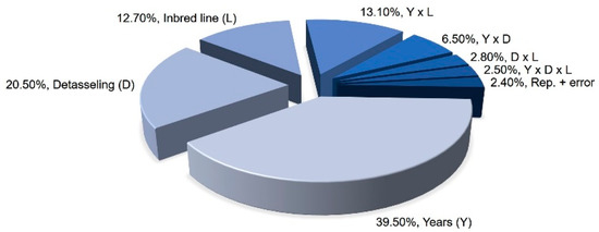 Experimental factors, as well as their interaction, exercised significant influence on seed yield (Table S2, Supplementary file). But the strongest influence was exercised by experimental years followed by detasseling methods which together explain 60% of the overall variance. The inbred line alone explains only 12.7% of the overall variance for seed yield. Interactions between factors explain 24.9% of overall variance (Figure 2).