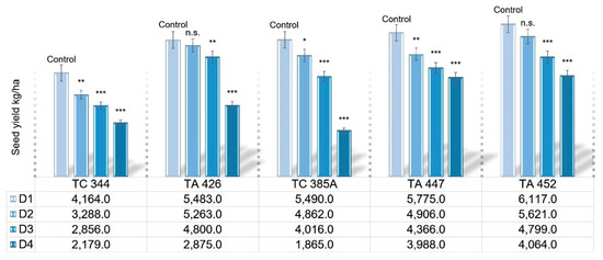 Combined effect of inbred line and detasseling method on maize seed yield (kg/ha) during 2015–2017; D1–D4 detasseling methods; inbreds code names: TC 344, TA 426, TC 385A, TA 447, TA 452; significance LSD p > 0.05 (n.s.), p < 0.05 (*), p < 0.01 (**), p < 0.001 (***).