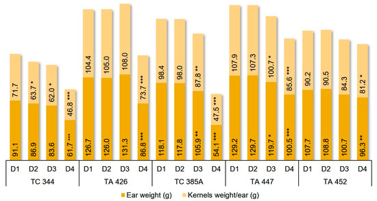 Combined effect of inbred line and detasseling method (D) on maize ear weight (g) and kernels weight/ear (g) during 2015–2017; significance LSD p < 0.05 (*), p < 0.01 (**), p < 0.001 (***).