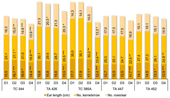 Combined effect of inbred line and detasseling method (D) on maize ear length (cm), number of kernels/row and number of rows/ear during 2015–2017; significance LSD p < 0.05 (*), p < 0.01 (**), p < 0.001 (***).