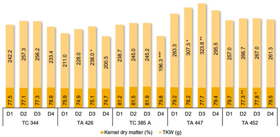 Inbred lines and detasseling methods significantly influenced all analyzed kernel traits (Table S3, Supplementary file). Detasseling and the interaction between detasseling and inbred line had a stronger influence on TKW (thousand-kernels weight) than on kernels dry matter and on kernel depth. Triple interaction Y × D × L had significant influence only on kernel depth and cob diameter. The experimental years did not influence significantly TKW (thousand-kernels weight) but exercised statistically significant influence on the other kernel traits (Table S3, Supplementary file). Out of the five inbred lines tested, only TA 452 experienced a significant decrease of kernel dry matter following D2 and D3 detasseling methods. The application of the D4 detasseling method caused a highly significant decrease of TKW for the line TC 385A (Figure 6).