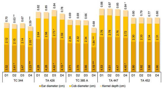 Combined effect of inbred line and detasseling (D) method on maize ear diameter (cm), cob diameter (cm) and kernel depth (cm) during 2015–2017; significance LSD p < 0.05 (*), p < 0.01 (**), p < 0.001 (***).