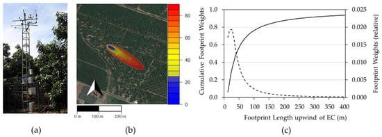 where HEC is the sensible heat flux (W m−2), LEEC is the latent heat flux (W m−2), ρ is the water vapor density (kg m−3), λ is the latent heat of vaporization (J kg−1), Cp is the specific heat capacity of air at constant pressure (J kg−1 °C−1), is the fluctuation on the vertical wind speed (m s−1), is the fluctuation in the air temperature (°C), and q’ is the fluctuation in the water vapor density (kg m−3) [,,,,]. The EC system used in this study consisted on a 3D sonic anemometer (Windmaster Pro, Gill Instruments, Hampshire, UK) and an open path gas analyzer of CO2/H2O (OP-2, ADC Bioscientific Ltd., Hoddesdon, UK). The footprint analysis was implemented by a one-dimensional model [] and a two-dimensional model [], using a MATLAB code (version 2019a) and the R-Package “FREddyPro” [], respectively. The peak footprint location (xmax) was about 18 m for a typical day under unstable conditions (Figure 1c). The cumulative normalized flux (CNF) measurements of 90% were around 200 m (Figure 1b).