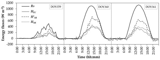 The traditional method to obtain α implies the use of the EC system to measure H, and thus generate the regression line forced through the origin against the uncalibrated H values estimated with SR. It is then possible to obtain H calibrated with α to finally estimate LE using the equation of surface energy balance (3) [,,]. Figure 2 shows an example of the effect of α in the determination of H, (daily pattern) for three consecutive days: a cloudy day (DOY 359) and two sunny days (DOY 360 and 361) (Solar radiation was included in the figure). In general, the uncalibrated values of H (H’SR) are higher than the measured, therefore, α factor must be applied to adjust the fluxes. From the figure, it is very evident that the use of the α factor allows correcting the sensible heat flux showing a good adjustment in the amounts and hourly variations.