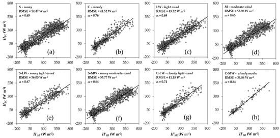 For all meteorological categories (9 conditions; 8 categories plus the whole dataset) α was estimated by simple linear regressions forced through the origin between H’SR and HEC, Equation (7). This analysis was performed for the data recorded every half-hour and for the daily accumulated data. The slopes of the regression lines correspond to the α values for each condition: