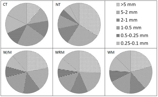 For soil aggregates in the surface layer (0–5 cm), the amount of non-erodible aggregates (>1 mm diameter) with NT was significantly greater than that with CT (Figure 1). Compared with corresponding conventional tillage, W/M, WRM, and WM increased non-erodible aggregates by 53.72%, 53.73%, and 54.89% in 2017, and 51.33%, 49.60% and 44.64% in 2018, respectively. There were significant differences between NT and CT at all the tested wind velocities (p < 0.05).