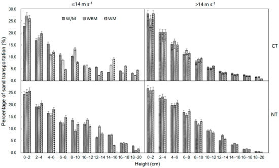 Percentage of sand transportation as affected by cropping system, tillage method, and wind velocity and height during two years. Note: CT, conventional tillage without wheat straw retention; NT, no-tillage with 25–30 cm tall wheat straw; W/M, annual wheat/maize strip intercropping; WRM, two-year wheat-winter rape-maize rotation; WM, two-year wheat-maize rotation. Error bars are standard errors of the means.