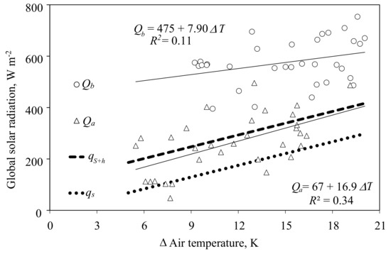One general problem with gas exchange measurements in greenhouses is the rising temperature in the cabin with increasing outside temperature and radiation. The facility was designed without an exterior shading screen that could be closed during high global solar radiation and thus could reduce heat penetration into the greenhouse. Without these screens, vents need to open to avoid overheating at certain conditions with high energy load. In Figure 4, outside global solar radiation just before the first daytime vent opening and after last daytime closing is illustrated from 26 March to 16 May 2016 (Experiment 2). In that period, the tomato crop occupied 24 m2 and the leaf area index (LAI) increased from 1.4 to 2.2 m2 m−2. The supply air rate was 200 m3 h−1. Surprisingly, even at very low differences between cabin air temperature and ambient air temperature, the vents could be kept closed in the morning during relatively high global solar radiation (Qb). In the afternoon, however, the vents closed almost as expected when global radiation fell to values close to the thresholds calculated above (Figure 4). Note that the latent heat transfer here, , is a rough estimate based on an assumed transpiration of 120 g m−2 h−1, a good value for a tomato crop. In other cases, the exact numbers depend on additional variables, such as LAI, the ratio of cultivation area to cabin floor area, global radiation, and the water vapor pressure deficit (VPD, kPa) of the air. The latter can be controlled in certain constraints by controlling the supply air rate. In the present example, at a constant supply air rate, VPD was significantly lower during high global solar radiation before the vents opened than during low global radiation after the vents closed, resulting in a similar transpiration rate in both situations.