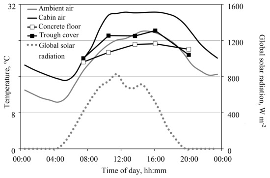 Consolidated, during morning hours the vents are kept closed longer than expected from calculations. Thus, gas-exchange measurements could be continued during these hours. There are obviously elements in the cabins with significant heat capacity, which act as cold storage during daytime, removing heat energy from the air in the morning hours, and heating the air as cabin air temperature drops during the night. One important heat sink is likely to be the concrete floor, which covers 60% of the cabin floor. Figure 5 depicts the temperature courses of the floor, the cabin and ambient air, and the global radiation on a sunny day in May. Interestingly, between 10:00 h and 19:00 h, when the outside air temperature was high, the differences in temperature between the cabin air and the concrete floor was on average 6 K. This is higher than the temperature difference between cabin and ambient air.
