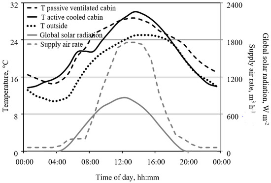 where (kg m−3) denotes the air density at standard conditions; cair (J kg−1 K−1) is the specific heat capacity of dry air; kroof (W m−2 K−1) is the thermal transmittance of the greenhouse roof, Aroof (m2) is the cabin roof area; and Ts, Te and Ta (°C) are the temperature of the supply, exhaust, and ambient air, respectively. Ts is higher than Ta due to the heat disposal of the ventilation units. For simplification, Equation (3) does not account for the effect of water vapor in the air. In addition to sensitive heat transfer, latent heat transfer (qlatent, W m−2) due to evapotranspiration must be taken into account: