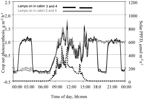 Daily course of net photosynthesis of a tomato crop measured in the open chamber mode and PPFD on the top of the crop on 24 November 2015 under two different light regimens. Data shows measurements taken in 9-min intervals. Leaf area index was 1.4 m2 m−2. CO2 concentration in the cabin air ranged between 500 µmol mol−1 during the dark and 350 µmol mol−1 during the light phases. In two cabins, artificial light of 210 µmol m−2 s−1 PPFD was supplied from 15:00 to 24:00, while plants in two other cabins received artificial light of the same intensity from 15:00 to 18:00, 20:00 to 23:00 and 01:00 to 04:00.