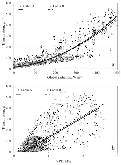 Transpiration of a tomato crop measured in the open chamber mode affected by global radiation (a) and vapor pressure deficit (VPD) (b). Data shows hourly averages of measurements in the period from 1 April to 16 May 2016. Leaf area index increased during this period from 1.5 to 2.2 m2 m−2. Air temperature ranged between 15 °C at night and 30 °C in the middle of sunny days. The continuous and dotted lines depict the empirical quadratic (a) and linear (b) response curves fitted with the data of the two cabins separately.