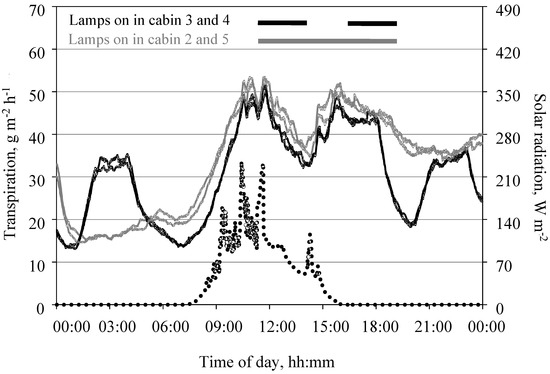 Daily course of transpiration of a tomato crop measured in the open chamber mode and global solar radiation on the top of the crop on 24 November 2015 under two different light regimens. Data shows measurements taken in 9-min intervals. Leaf area index was 1.4 m2 m−2. H2O concentration in the cabin air ranged between 8 mmol mol−1 during the dark and 14 mmol mol−1 during the light phase. In two cabins, lamps emitted radiation of 78 W m−2 from 15:00 to 24:00 while plants in two other cabins received radiation of the same intensity from 15:00 to 18:00, 20:00 to 23:00, and 01:00 to 04:00.