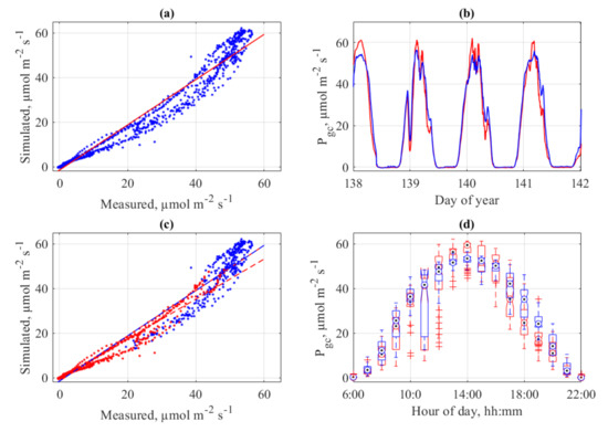 For the use in crop model validation, the block-shaped 3-dimensional photosynthesis model was used. For that, the tomato cultivar ‘Pannovy’ was parameterized and fitted to the photosynthesis parameters. The resulting model was used to compare the pure measured photosynthesis (i.e., CO2 gas exchange) as discussed above with simulated photosynthesis. The results show a good fit between measured and simulated crop gross photosynthesis (Figure 13). The overall agreement as calculated with adjusted R2 is with 0.976 very high. However, larger differences and underestimations of the modeled CO2 gas exchange exist. Especially a difference between morning and afternoon fits are evident (Figure 13c), which is probably the lack of a mid-day repression or hysteresis in the model. These discrepancies have been observed in earlier measurements of the same system, while however no model comparison was made [35]. However, the combination of physical gas-exchange measurements in a crop stand in combination with parameterized photosynthesis models is a powerful tool for improvement of crop photosynthesis predictions. The next steps are among others screening and parameterization of different cultivars and crops.