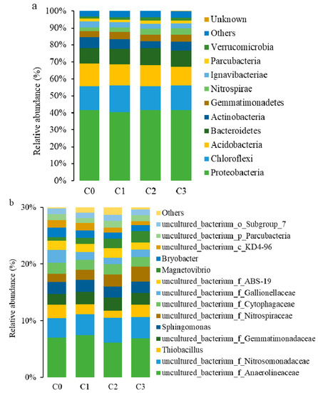 In the present study, of the nearly 400 bacterial genera that were classified, the relative abundances of 51 genera showed significant (p < 0.05) differences with different biochar addition rates (Supplementary Materials, Table S2). Fifteen dominant genera (relative abundance > 1%) were found in all treatments (Figure 2b). The relative abundance of dominant genera were 28.7%–29.8% in four treatments. The relative abundance of uncultured Nitrosomonadaceae, uncultured Gemmatimonadaceae, uncultured Nitrospiraceae and Magnetovibrio increased in biochar amended soils. Conversely, the relative abundance of Thiobacillus and uncultured Gallionellaceae decreased with biochar amendments. Of all the bacteria, the relative abundances of uncultured Nitrospiraceae changed most significantly, which increased with increasing biochar application rates (p < 0.05). The relative abundance of uncultured Nitrospiraceae in C1, C2 and C3 were 16.9%, 42.8% and 73.6% higher, respectively, than that of C0. In contrast, the relative abundance of Bryobacter and uncultured KD4-96 declined significantly (p < 0.05) as the biochar dose increased.