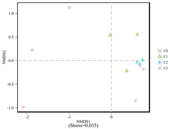 Non-metric multidimensional scaling analysis (NMDS) was used to evaluate the effect of biochar application on the microbial community structure of soil (Figure 3). The bacterial communities sampled at C0 treatment were separated from those sampled at C1, C2 and C3.A higher similarity of soil bacterial community composition was found with the increase in biochar application. The result demonstrated that biochar application changed the bacterial community structure significantly.