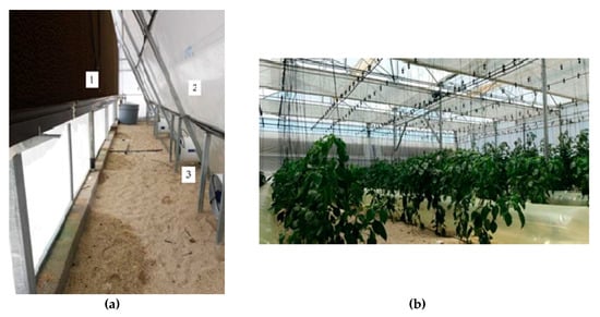 In the case of greenhouses in semi-arid climates, the most commonly used cooling systems are natural ventilation and shading, due to their low economic cost. However, natural ventilation has the inconvenience of pests and/or vectors of disease entering the greenhouse, so the air vents need to be protected with anti-insect screens, which can reduce air renewal to inadequate levels [5,6]. During the hottest months of the year (April to September), ventilation is usually combined with greenhouse roof whitening, which reduces radiation inside to values ranging from 30% to 50% that of the outside, albeit with little homogeneity [7,8]. Other drawbacks of whitening include the level of constant shading throughout the day, the high water consumption required to remove it, the need to repeat the whitening operation in the case of rain and the reduction in the cover’s lifespan [9]. The use of fixed shading screens allows one to choose the proportion of radiation inside the greenhouse and provides more homogeneous shading. However, as with whitening, the shade screens produces a constant shade and, if it they installed inside the greenhouse, the ventilation rates are reduced [10]; if outside, they can be mobile, although these also have drawbacks, such as the cost incurred for their installation and the increased loads on the greenhouse structure itself [11,12].