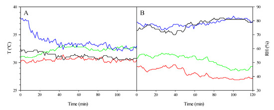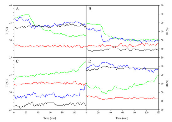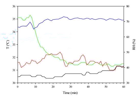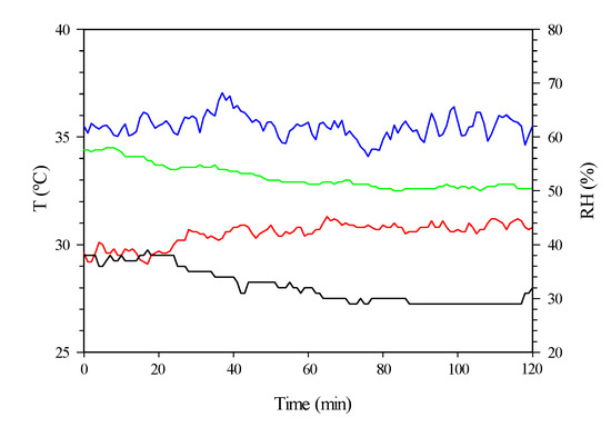 Figure 4 shows the evolution over time of T and RH, both outdoors and inside the greenhouse, during test 1. The temporal evolution of ωg presents a maximum value at 8 min from the start of the test, followed by a rapid decrease (data not shown). At that instant, the Tg and RHg began to vary, probably due to the transient nature of the process.