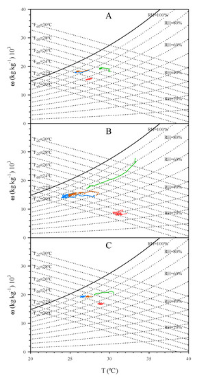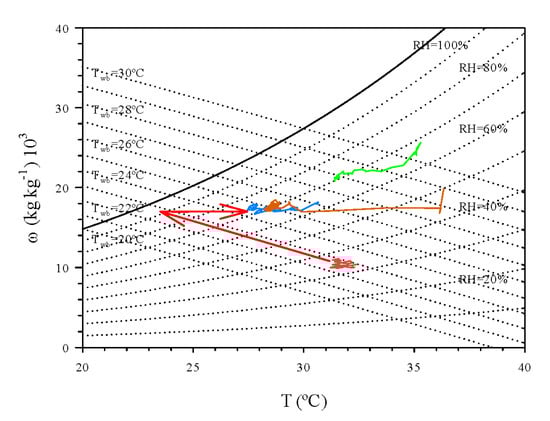 When circulating through the pad, the air undergoes evaporative cooling at the adiabatic constant saturation temperature, i.e., at the wet bulb temperature, Twb, which is approximately constant. The result is an increase in its specific humidity (ω, kg kg−1), a decrease in its T and a slight increase in its RH. The evaporative cooling is represented in Figure 5 by the red slanted arrow. Its extreme indicates the theoretical value of the air T at the output of the pad, Tp, even though the value of Tc is higher. The difference between the state of the air at the pad outlet and in the pre-camera is due to energy transfer, represented by the red horizontal arrow (ω = cte). The explanation for this pre-chamber air heating is found in the elevated SR value during the test, the fan-pad system’s installation on the south side of the greenhouse and the pre-chamber’s insufficient thermal insulation.